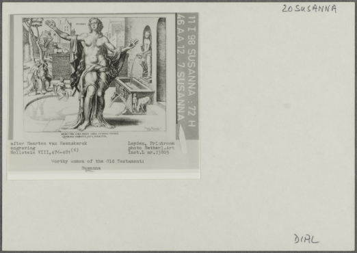 Kehren wir nun zurück zu unserer Bildkarte, so wird klar, dass es sich um die fotografische Reproduktion einer Bildkarte aus van de Waals Index handelt. Auf einem vertikalen Streifen finden sich rechts neben dem Bild zwei mittlerweile überholte DIAL-Annotationen (die heute geläufige ICONCLASS-Notation wäre »71P4122: The elder making advances towards Susanna«). Die Bildlegende gibt außerdem einen Verweis auf das epochemachende Werkverzeichnis niederländischer Grafik von Friedrich Wilhelm Hollstein. Ferner verrät sie, dass ein Exemplar von Galles Stich im Grafikkabinett der Universität Leiden abfotografiert wurde. Von 1950 bis 1982 gab das RKD insgesamt 15.000 Bilder im Postkartenformat heraus, sodass der DIAL in identischer Form für seine Abonnenten verfügbar war. Auch Martin Warnke wird so zu dem Objekt gekommen sein, dessen Reproduktion er dann in seinem eigenen Index verwendete.