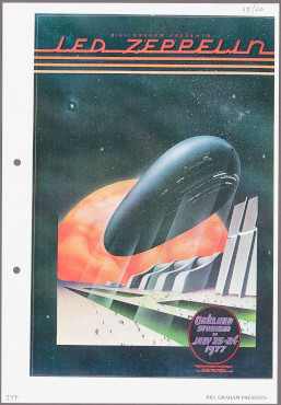 Neben zwei psychedelischen Original-Handzetteln mit Entwürfen der Künstler Griffin und Wilson befindet sich in dem überschaubaren Konvolut unter einem der zentralen Stichworte der politischen Ikonografie ein motivisch bemerkenswertes Beispiel der populären Plakatkunst der Ära Graham. Es ist die farbxerografische Reproduktion eines Veranstaltungsposters, das jenes Konzert bewirbt, das den letzten Live-Auftritt von Led Zeppelin in den USA dokumentiert, bevor sich die Musikgruppe 1980 auflöste. Die vierköpfige Band spielte im Rahmen einer mehrmonatigen Nordamerikatour am 23. und 24. Juli 1977 im Oakland Stadium (auch als Oakland Coliseum bekannt) vor zehntausenden Fans. Der Plakatentwurf zu jener Show entstand, wie sich rechts unten lesen lässt, aus einer Kollaboration der kalifornischen Grafikdesigner Randy Tuten und William »Daddy Bread« Bostedt und zeigt, gleichsam als symbolische Evokation des Bandnamens, ein monumentales Luftschiff mit charakteristischem ovalen Umriss, das unterhalb des Schriftzuges »Led Zeppelin« das Zentrum des Entwurfs beherrscht.