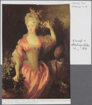 In den Bildindex zur Politischen Ikonographie wurde die Bildkarte in der Oberkategorie »Exotica« unter dem Stichwort »Farbige« (120/10) eingerückt. Sie zeigt ein vom französischen Maler Nicolas de Largillière, berühmt für seine Bildnisse von Angehörigen der gehobenen Gesellschaft, im Jahr 1707 geschaffenes Porträt der »weißen« Comtesse de Rupelmonde, Marie-Marguerite-Élisabeth d’Alègre, gemeinsam mit ihrem namenlosen »schwarzen« Diener (England, Privatsammlung). Vor einer dunklen Landschaft wird die Gräfin in aufrechter Pose als Dreiviertelfigur gezeigt. Sie trägt ein opulentes Kleid aus Satin, die Livree des Knaben oder jungen Mannes, die ihn unübersehbar als Diener identifiziert, nimmt in Kostbarkeit und Kolorit Bezug auf die Dame; doch die Braun- und Bronzetöne seines Gewandes sowie seine dunkle Körperfarbe lassen ihn mit dem Hintergrund verschmelzen. Die Livree ist hochgeschlossen und endet in einem breiten metallenen Halsband, während der schlanke Hals der Gräfin durch das tief ausgeschnittene Dekolleté und ihre scheinbar makellose Haut umso deutlicher betont wird.