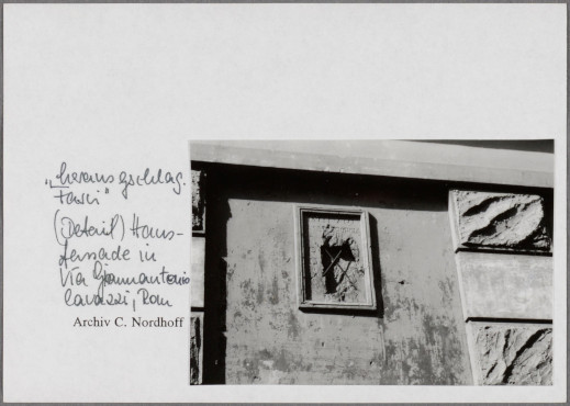 Eine ungewöhnliche Bildkarte, denn zu sehen ist die Existenz der Nichtexistenz. Das klingt zuerst einmal verwirrend, aber so kompliziert ist es gar nicht. Zu sehen nämlich ist der Ausschnitt einer Hausfassade im römischen Viertel Garbatella, aus der etwas gewaltvoll herausgebrochen wurde, wodurch ein Loch in der Wand zurückgeblieben ist. Das Besondere an dieser Leerstelle ist, dass durch deren Form noch erkennbar ist, was zuvor dort angebracht war: das Symbol des Liktorenbündels. Dieses bestand aus mehreren Ruten, die mit einer Schnur zu einem Bündel (fasces) zusammengefasst waren, in das ein Beil gesteckt wurde. Das Symbol war Teil einer Steintafel, die noch immer die Inschrift »Istituto case popolari Roma« trägt, einer staatlichen Einrichtung, die sich in den letzten hundert Jahren dafür einsetzte, bezahlbaren Wohnraum zu schaffen.