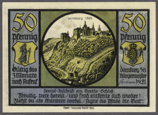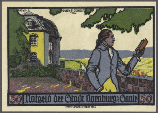 Die Erinnerung an einen der größten deutschen Dichter nahm der Jenaer Künstler Georg Kötschau (1889-1976) zum Anlass, um für die Stadt Dornburg eine Serie von Notgeldscheinen zu gestalten. Sie wurden zum 1. September 1921 ausgegeben und waren nur für drei Monate gültig. Kötschau wurde mit 15 Jahren zum Lithografen ausgebildet und war als technischer Zeichner im Dienste großer Unternehmen wie Carl Zeiss in Jena tätig. Aufgrund seiner Kinderlähmung wurde er im Ersten Weltkrieg nicht eingezogen und war als Illustrator von Notgeldscheinen gefragt. Er gestaltete Scheine für Gemeinden und Städte überwiegend in Thüringen, beispielsweise für Lobeda, Saalfeld und Dornburg. Sein Stil spiegelt die frühere Tätigkeit als technischer Zeichner in klaren Linienführungen und Perspektiven wieder. Mit ihrer intensiven Farbgestaltung und ihrem Licht- und Schattenspiel lässt Kötschaus Gestaltung zentrale Motive von Goethes Dornburg-Gedicht anklingen, in dem das wechselnde Licht- und Farbspiel des Morgenhimmels über dem Saaletal beschrieben wird.