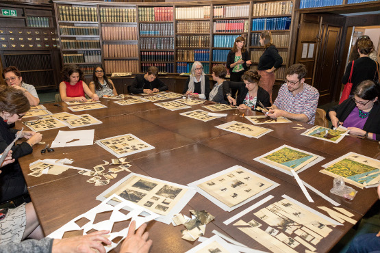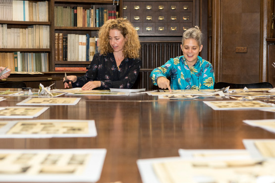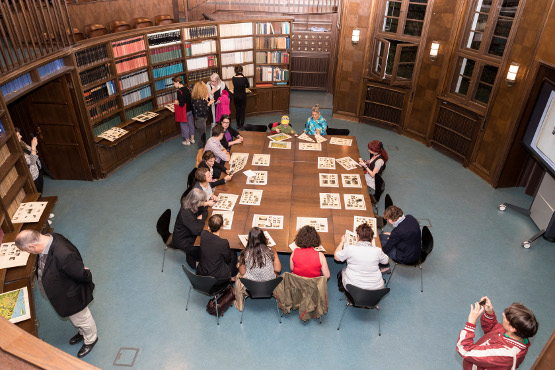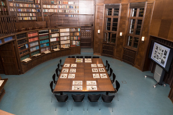 On two evenings, visitors were invited to discover Anna Warburg’s memory album through the artist’s work. The original pages of the album were exhibited on the bookshelves of the oval reading room. Guests were invited to take a seat with Hila Laviv at a table in the middle of the reading room and to investigate the mechanisms and history of the memory album in a joint work process on copies of the album, taking up the practice of the artist herself. In the participatory performance, visitors and participants were free to move in the room, extending the experience towards meanings of movement, travel, migration, return and remembrance.