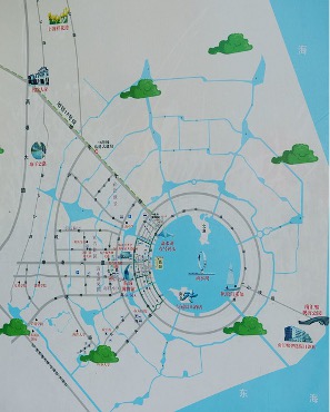 Shanghai – Lingang City. Im Jahre 2001 fielen alle Blicke auf ein Gebiet zwischen den Mündungen des Jangste und des Qiantang an der Hangzhou-Bucht – etwa 60 km südöstlich des Zentrums von Shanghai. Hier sollte im Rahmen eines Architekturwettbewerbs ein quasi-Utopia entstehen: Lingang New City. Wesentlicher Impuls für die Planung einer Hafenstadt war die Zielsetzung seitens der chinesischen Regierung die CO2-Reduzierung und die grüne Stadtentwicklung zu fördern. Neben einem Fünfjahresplan (2011-2015) für die CO2-Reduzierung wurde Lingang City neben Chongming Island und Honqiao District im Jahre 2008 für das WWF-Pilotprojekt “Low-Carbon-Initiative in China” ausgewählt.[5] Im Jahre 2002 gewann das Hamburger Architektenbüro gmp in Zusammenarbeit mit der HPC Hamburg Port Consulting den ersten Preis, worauf das städtebauliche Gutachten von 2002 für 300 000 Einwohner auf 65 Quadratkilometern Fläche in den Jahren 2003 bis 2004 auf 450 000 Einwohner vergrößert wurde. Zusätzlich sah der Masterplan eine Schwerindustrie-, Forschungs- und Entwicklungs- sowie Mehrzweckzone als auch drei Kleinstädte mit 100 000 bis 200 000 Einwohnern vor.[6] Das städtebauliche Konzept berücksichtigte ökologische, ökonomische und sozial gut verträgliche Bedingungen, um ein hohes Maß an Lebensqualität zu gewährleisten. Lingang City sollte sich mit einer entsprechend geringen Bevölkerungsdichte und einem hohen Grünflächenteil so bewusst von dem hoch verdichteten Shanghai abgrenzen.[7] Um eine infrastrukturelle Verbindung zwischen Lingang New City und Shanghai herzustellen, entwickelte gmp ein Verkehrskonzept mit Fernbahn in die Großstadt. Alle weiteren städtebaulichen Maßnahmen sollten unter den Gesichtspunkten “High-End Industrie”, “Internationalisierung der Stadt” und “Ökologische Umwelt” entsprechend dem “Umsetzungsplan für eine Low-Carbon-Entwicklung” im Fünfjahresplan definiert werden.[8] Wesentliches städtebauliches Merkmal von Lingang New City ist die Orientierung an tradierten Überlieferungen des europäischen Städtebaus: Die für chinesische Großstädte typische bauliche Verdichtung des Stadtzentrums weicht in Lingang New City einem kreisrunden See von 2,5 Kilometer Durchmesser mit 8 Kilometern Uferpromenade.[9] Rund um den See schließt sich das verdichtete Innenstadtnetz aus Verwaltung, verdichtetem Wohnen und Einkaufsmöglichkeiten. Der in “dritter Reihe” gelegene Stadtpark grenzt das verdichtete Stadtzentrum von den quadratisch angelegten Wohnquartieren ab. Zwischen den Wohnquartieren schieben sich Grünflächen ein, die für jedes einzelne Quartier Naherholungsflächen darstellen. Die konzentrische Struktur des gesamten Stadtbildes sorgt für eine klare Einteilung in einzelne Sektoren und unterliegt einer stringenten Ordnung. Die konzentrische Struktur wird von radialen Straßen und Wegen durchzogen. “The inspiration was the image of a drop falling into the water and these circles create the structure of the city,” äußerte sich der Projektmanager von gmp zu der konzentrischen Struktur des Plans.[10]