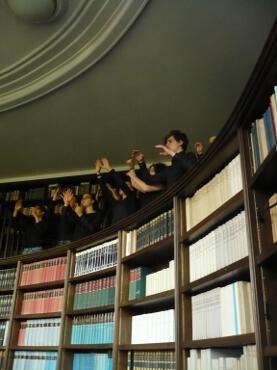 Der aus diesem Anlass umgekehrt, mit dem Blick auf die Bücherwände und den Chor auf den Emporen, bestuhlte, holzgetäfelte Lesesaal des Warburg-Hauses schien nicht nur wie gemacht für die musikalische Einrichtung für Marimbaphon und Orfeos Bewegung zwischen Unter- und Oberwelt: Sämtliche Zuhörer waren gebannt und geradezu überwältigt von der Klarheit und Kraft, mit der Martin Lissel den Orfeo gab und der musikalischen Gewalt des Kammerchors.
