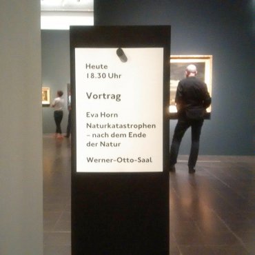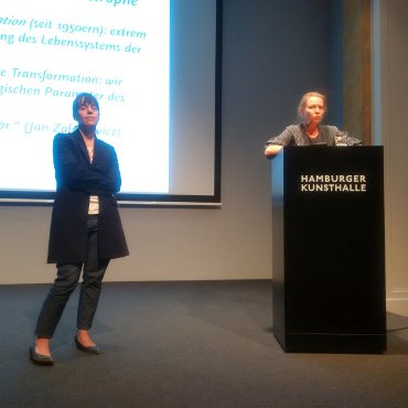 Um 18 Uhr folgte nach ihrer Vorstellung durch Cornelia Zumbusch, Direktorin des Warburg-Hauses, der Abendvortrag der Kulturwissenschaftlerin Eva Horn (Lehrstuhl für Neuere Deutsche Literatur, Universität Wien): »Naturkatastrophen – Nach dem Ende der Natur«. Eva Horn hat 2014 das Buch Zukunft als Katastrophe zu Frage und Motiven des modernen Katastrophenbewusstseins in Zukunftsvorstellungen publiziert und hat zuletzt im Rahmen des DFG-Schwerpunktprogramms »Ästhetische Eigenzeiten – Zeit und Darstellung in der polychronen Moderne« das Forschungsprojekt »Zeit des Klimas. Zur Verzeitlichung von Natur in der literarischen Moderne« geleitet.