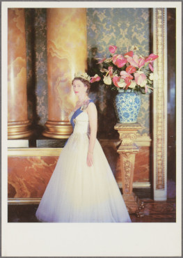 Der Mode- und Society-Fotograf Cecil Beaton, dessen Porträt der britischen Queen von 1955 die uns vorliegende Bildkarte aus dem Bildindex zur politischen Ikonographie ziert, produzierte jahrzehntelang Bildnisserien der Mitglieder der königlichen Familie, die weltweit kursierten und das Image der Monarchie mitgestalteten. Beaton positioniert die junge Königin hier in klassischer Dreieckskomposition im Profil vor hochwertigem Interieur. Sie wendet den Kopf und ihr aufmerksamer Blick adressiert die Betrachterin. À la mode ist ihr luftiges weißes Ballkleid, dessen Tülllagen jene A-Form bilden, die Mitte der fünfziger Jahre besonders gefragt war. Ihren schlanken Körper betonend ist das Kleid ärmellos gestaltet. Die weit dekolletierte Büste ist bedeckt vom blauen Band des Hosenbandordens. Elisabeth II. trägt das zierliche Diamond Diadem, das seit Königin Victoria zum royalen weiblichen Regalienkanon gehört. Drei Reihen Perlen schmücken ihren Hals, ein schmales Armband und ein Ring ergänzen ihre dezente Aufmachung. Beatons Konzept, die Füße der Königin auszusparen, rückt diese näher an den Bildrand und macht sie somit nahbarer für den Betrachter. Auch das hochmodische Kleid verknüpft Betrachter und Königin, indem es auf einen gemeinsamen Modekosmos anspielt.