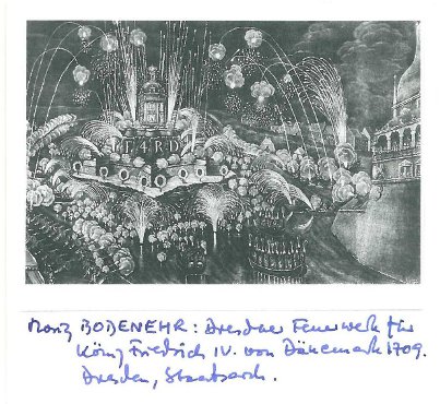 Aus unserem Bildindex zur politischen Ikonographie, 140/5 Feste. Beschriftet von Martin Warnke: "Moritz Bodenehr: Dresdner Feuerwerk für König Friedrich IV. von Dänemark, 1709"