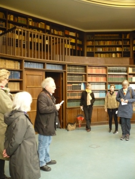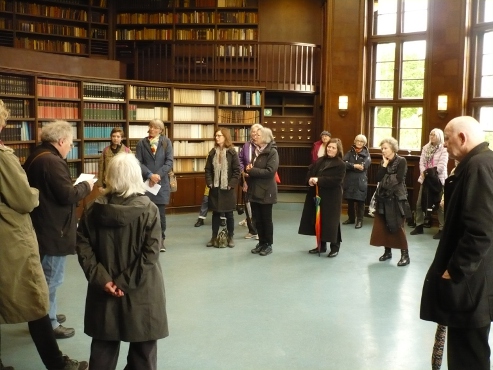 Erste Station war der eigens vollständig leer geräumte Lesesaal des Warburg-Hauses, in dem Hermann Hipp, der führende Kenner der norddeutschen und insbesondere Hamburger Architekturgeschichte und Experte für die Geschichte des Warburg-Hauses und den ehemaligen Hamburger Oberbaudirektor Fritz Schumacher, enger Weggefährte Aby Warburgs, in die Geschichte des 1925/26 neben dem Wohnhaus der Familie in Hausnummer 114, das Warburg 1909 erworben hatte, errichteten Bibliotheksgebäudes und die Bedeutung der elliptischen Grundform seines Herzstücks, des Lese- und Vortragssaales, einführte.
