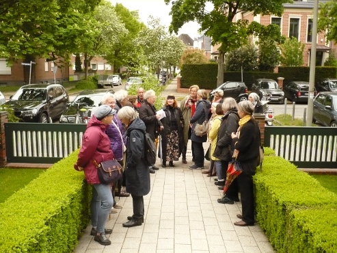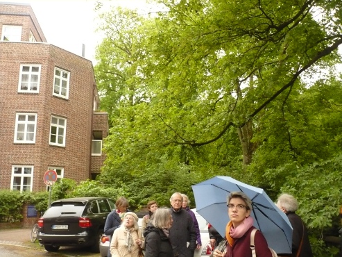 Anschließend begab sich die Gruppe vor das Haus, wo Hermann Hipp ausführlich die verschiedenen Verweise und Verbindungen erläuterte, die sich in der äußeren Gestaltung des Hauses und der Fassade der ehemaligen Kulturwissenschaftlichen Bibliothek Warburg zum Bankhaus M.M. Warburg, der Hamburger Bautradition in Rotklinker und Kontorhausarchitektur und dem Kontext der stadtplanerischen Erschließung und Entwicklung Eppendorfs als großbürgerlichem Wohnviertel ab der Jahrhundertwende ergeben.