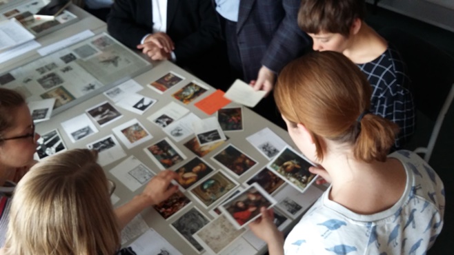Am Beispiel „Affekte“ schauten sich die Studierenden dann selbst eine Auswahl an Bilderkarten an: Unter welchen Schlagworten in der Systematik findet sich etwas zu diesem Thema? Wo liegt der Schwerpunkt der Visualisierung von Affekten eher auf einem Ausdruck in Gesten, und bei welchen Begriffen sind eher Bilder unterschiedlicher Mimik versammelt, über die sich Affekte mitteilen? In der Diskussion ergaben sich viele Aspekte, an denen sich weiterfragen und weiterarbeiten ließe. Gelegenheit dazu bietet der Bildindex Politische Ikonographie mit seinem Bestand von etwa 400.000 Karten reichlich – und von Lüneburg nach Hamburg ist es ja nicht weit…